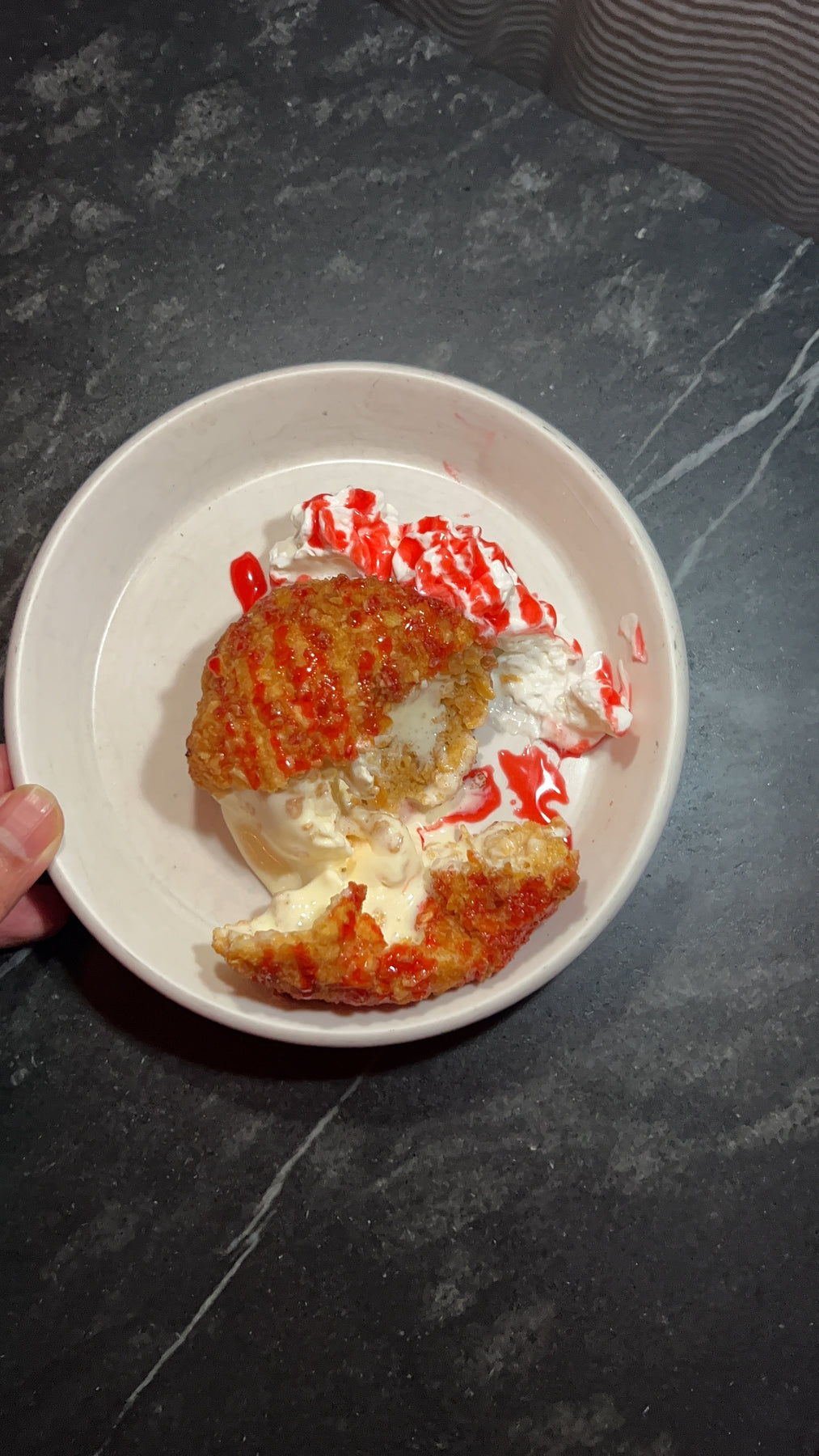 • Deep Fried Red Bean Ice Cream coated in Cornflakes and drizzled with Rose Syrup